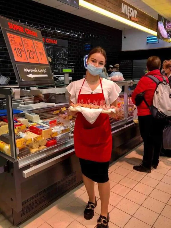 - zachęcanie odwiedzających stoisko w sklepie lub na imprezach do zapoznania się ze smakami różnych wędlin kiełbas, szynek, parówek, kabanosów
